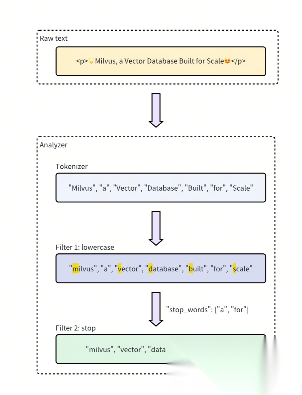 - Filter**(过滤器)**:对 token 进行特定的处理方法,Milvus 内置了丰富的 filter,例如统一大小写(Lowercase)、去掉标点(Removepunct)、停用词过滤(Stop)、词干提取(Stemmer)、正则匹配(Regex)等。Milvus 支持设置多个 filter 按顺序处理,可以满足复杂的 token 处理需求。