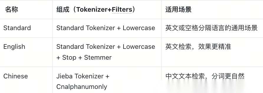 内置 Analyzer 是 Milvus 自带的标准配置,开箱即用,适合大多数常见场景。它们已经预定义好 Tokenizer 和 Filter 的组合: