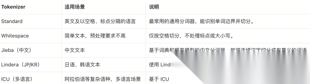 - Tokenizer**(分词器)**:负责把文本切分成基础的 token,例如按空格切分(Whitespace)、中文分词(Jieba)、多语言分词(ICU)等。
