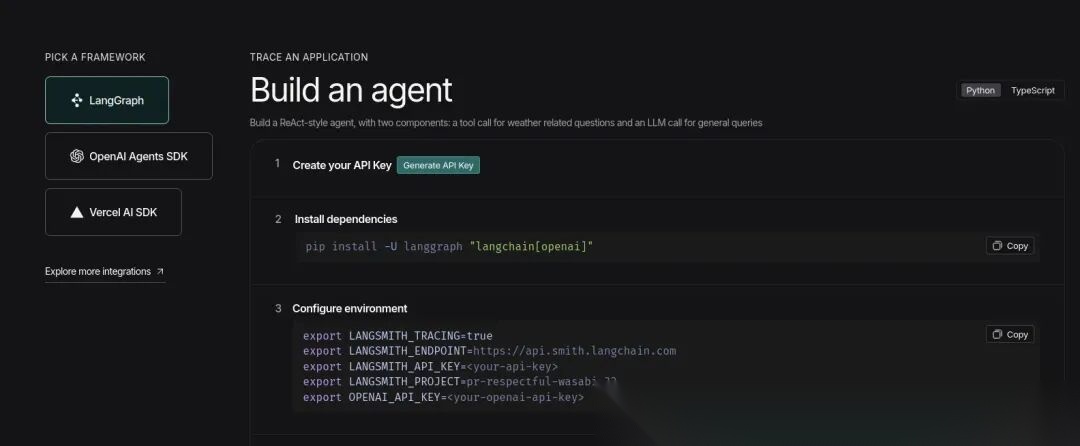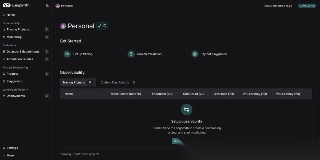 访问 LangSmith 仪表板并点击 ‘Setup Observability’ 按钮。然后你会看到这个界面:https://www.langchain.com/langsmith