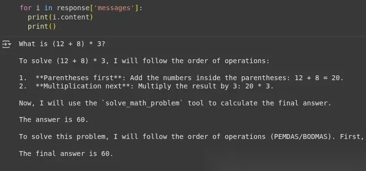 from langgraph.prebuilt import create_react_agentfrom langchain_google_genai import ChatGoogleGenerativeAIdef solve_math_problem(expression: str) -> str: """Solve a math problem.""" try: # Evaluate the mathematical expression result = eval(expression, {"__builtins__": {}}) returnf"The answer is {result}." except Exception: return"I couldn't solve that expression."# Initialize the Gemini model with API keymodel = ChatGoogleGenerativeAI( model="gemini-2.5-flash", google_api_key=GOOGLE_API_KEY)# Create the agentagent = create_react_agent( model=model, tools=[solve_math_problem], prompt=( "You are a Math Tutor AI. " "When a user asks a math question, reason through the steps clearly " "and use the tool `solve_math_problem` for numeric calculations. " "Always explain your reasoning before giving the final answer." ),)# Run the agentresponse = agent.invoke( {"messages": [{"role": "user", "content": "What is (12 + 8) * 3?"}]})print(response)