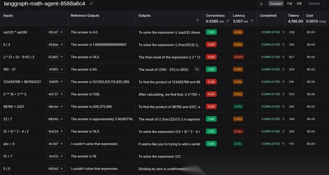 from langsmith import Client, wrappersfrom openevals.llm import create_llm_as_judgefrom openevals.prompts import CORRECTNESS_PROMPTfrom langchain_openai import ChatOpenAIfrom langgraph.prebuilt import create_react_agentfrom langchain_core.tools import toolfrom typing import Dict, Listimport requests# STEP 1: Define Tools for the Agent =====@tooldef solve_math_problem(expression: str) -> str: """Solve a math problem.""" try: # Evaluate the mathematical expression result = eval(expression, {"__builtins__": {}}) returnf"The answer is {result}." except Exception: return"I couldn't solve that expression."# STEP 2: Create the LangGraph ReAct Agent =====def create_math_agent(): """Create a ReAct agent with tools.""" # Initialize the LLM model = ChatOpenAI(model="gpt-4o-mini", temperature=0) # Define the tools tools = [solve_math_problem] # Create the ReAct agent using LangGraph's prebuilt function agent = create_react_agent( model=model, tools=[solve_math_problem], prompt=( "You are a Math Tutor AI. " "When a user asks a math question, reason through the steps clearly " "and use the tool `solve_math_problem` for numeric calculations. " "Always explain your reasoning before giving the final answer." ), ) return agent