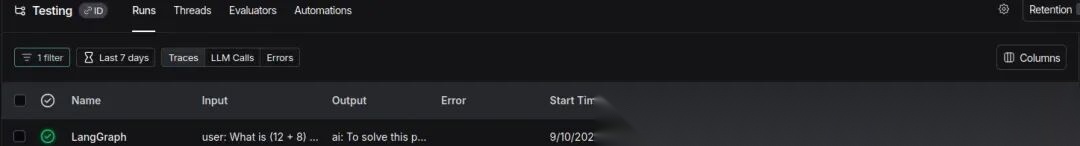 我们可以看到智能体使用了工具的响应 ‘The answer is 60’,并且在回答问题时没有产生幻觉。现在让我们查看 LangSmith 仪表板。