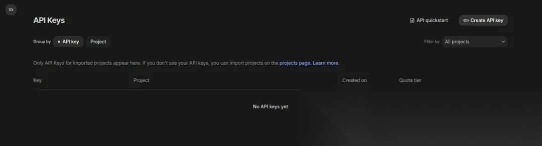点击右上角的 ‘Create API key’,如果项目不存在则创建一个,并将密钥放在手边。