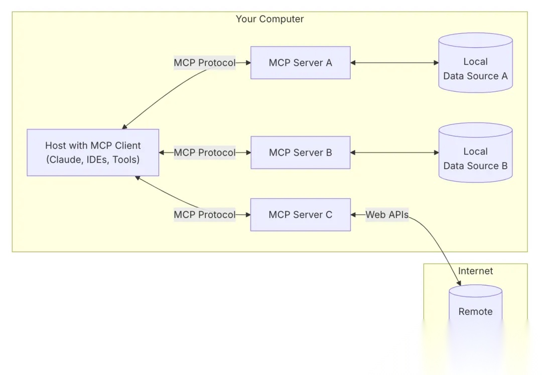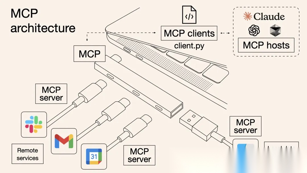 类比来看,不同的AI助手就像不同的电子设备,以前每个设备需要不同的数据线连不同的外设(比如老式手机数据线各不相同),而MCP提供了一个统一的细窄接口,让AI能够即插即用各种外设。例如,通过MCP,一个AI助手今天可以连U盘(数据库),明天插打印机(邮件系统),后天接显示器(报告生成)——接口都一样,只是功能不同。就像USB-C让我们少了无数转换头和线缆,MCP也让AI集成少了无数专有API和脚本。对于终端用户来说,这意味着AI助手将变得更加多才多艺且使用方便,因为背后复杂的连接都被这个看不见的"USB-C"标准屏蔽掉了。