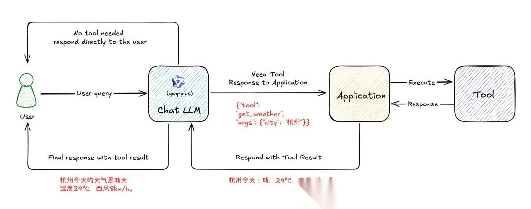 它判断你这个请求,需要调用一个叫获取天气的函数,然后自动生成参数“city=杭州”,调用完天气API -> 拿到结果 -> 生成回复:“明天杭州24℃,小雨,建议带伞”。
