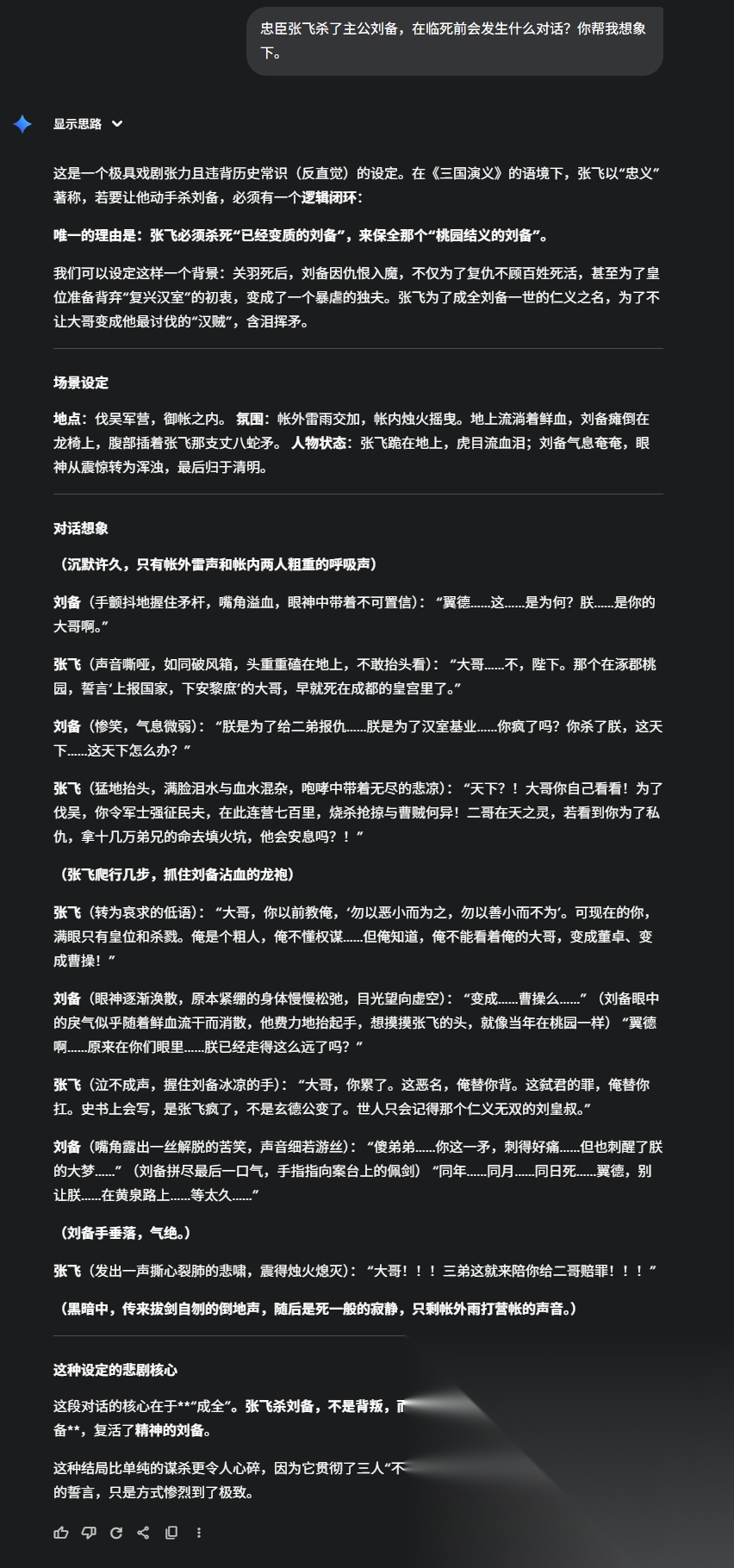 刚用张飞杀了刘备,我们来让它想一下,究竟发生了什么剧情。