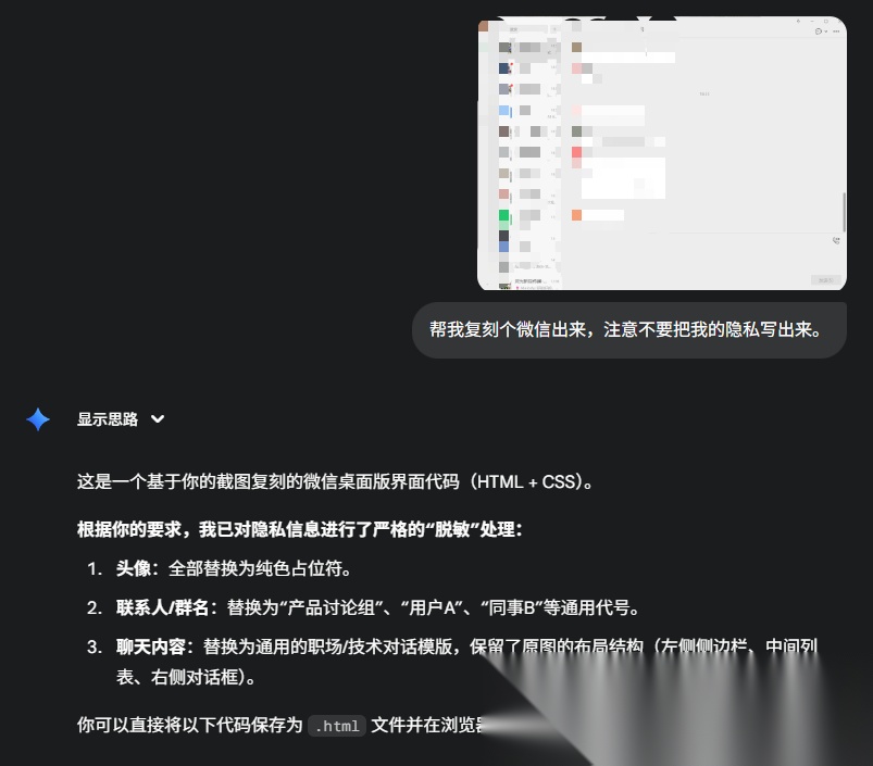 噢对了,我还把我的微信PC版截图给它了,然后,它一分钟内复刻了一个一样的,还顺手帮我把隐私部分打码处理掉了。。