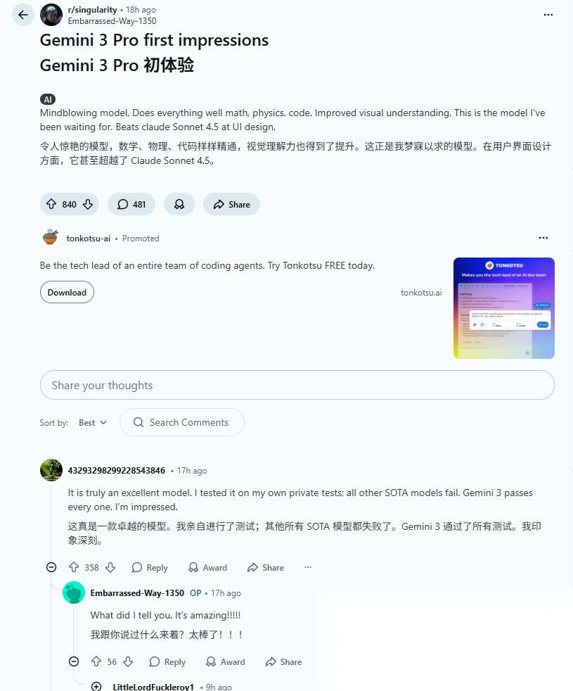 其实从网上风向和各种跑分图,一切都在暗示——这次 Gemini 3 是真牛大了。