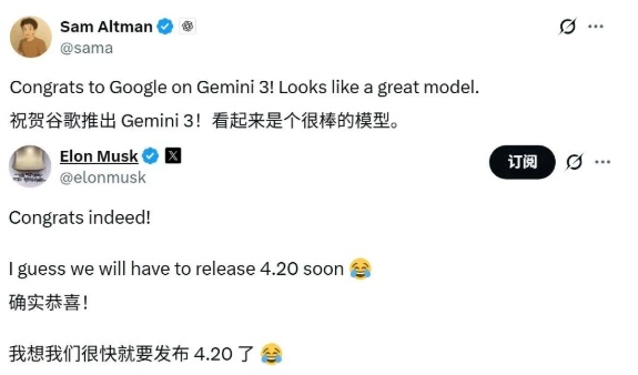 连奥特曼和马斯克这两位死对头,都罕见地统一战线了:“Gemini 3 真的很不赖。”