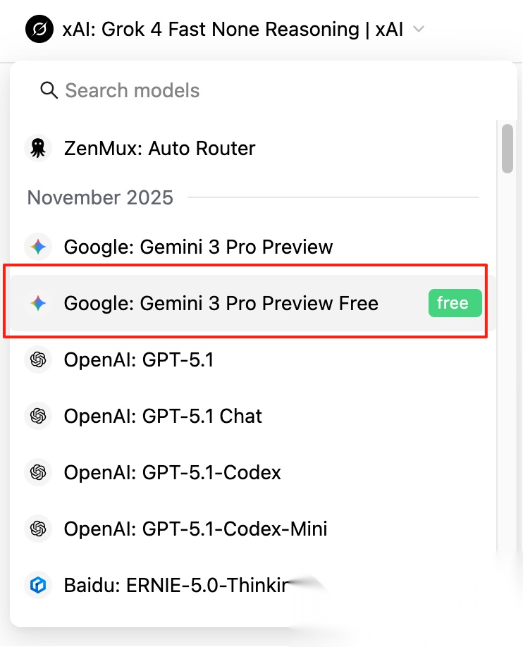 它是个中转站,就和 OpenRouter 类似。现在ZenMux上有有个免费版的 Gemini 3 可以用。