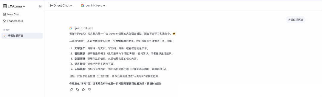 这其实是个训练场,主要用途是让用户体验各家大模型的,比如前几天 Gemini 3 发布之前,就用一个匿名名称放到这个平台让人体验测试了。