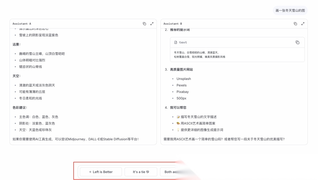 比如我问完一个问题,两个模型回答问题,然后你可以选择哪个回答更好,给它投票。投完票后会显示模型的名称。