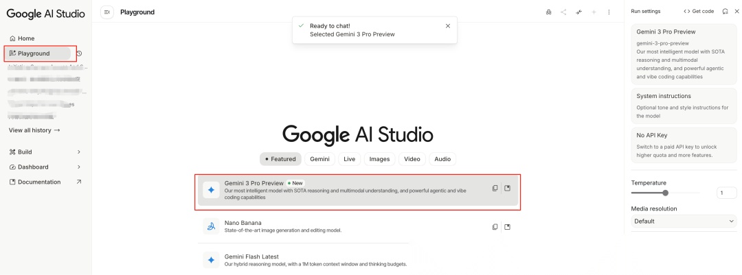 最简单的就是通过 Google 的 AI Studio,访问地址 https://aistudio.google.com/ ,可以看到 Gemini 3 Pro Preview 选项,点一下,在下面输入提示词就可以用了。