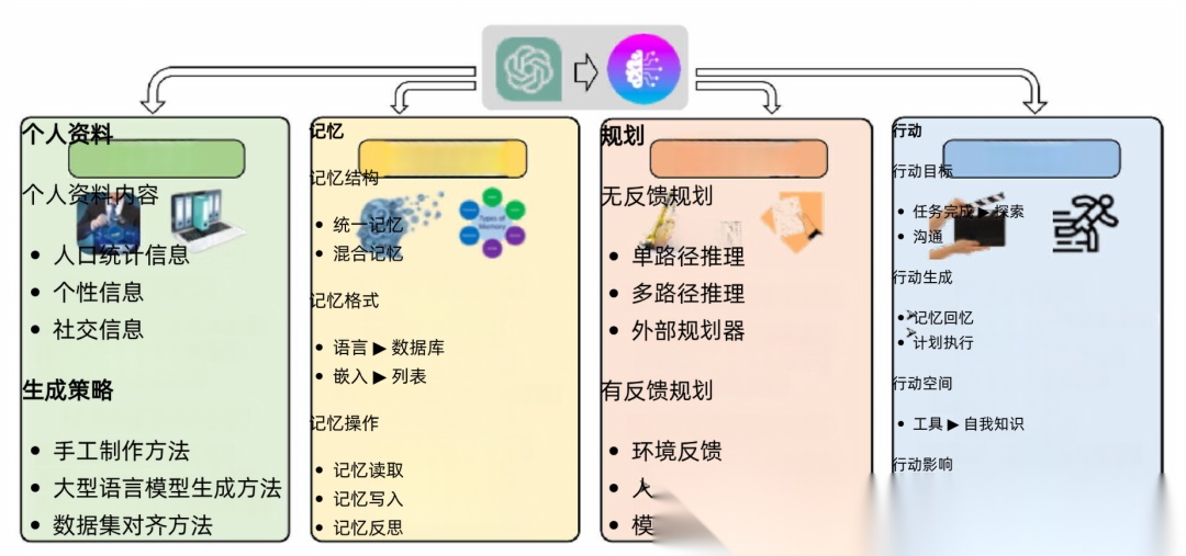 高瓴人工智能学院发布的基于大模型模型的自主智能体综述中,认为智能体主要包括角色设定、记忆模块、规划模块和行动模块。
