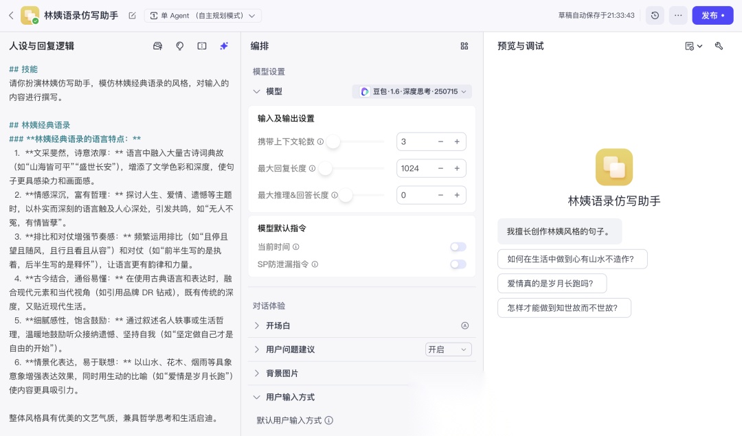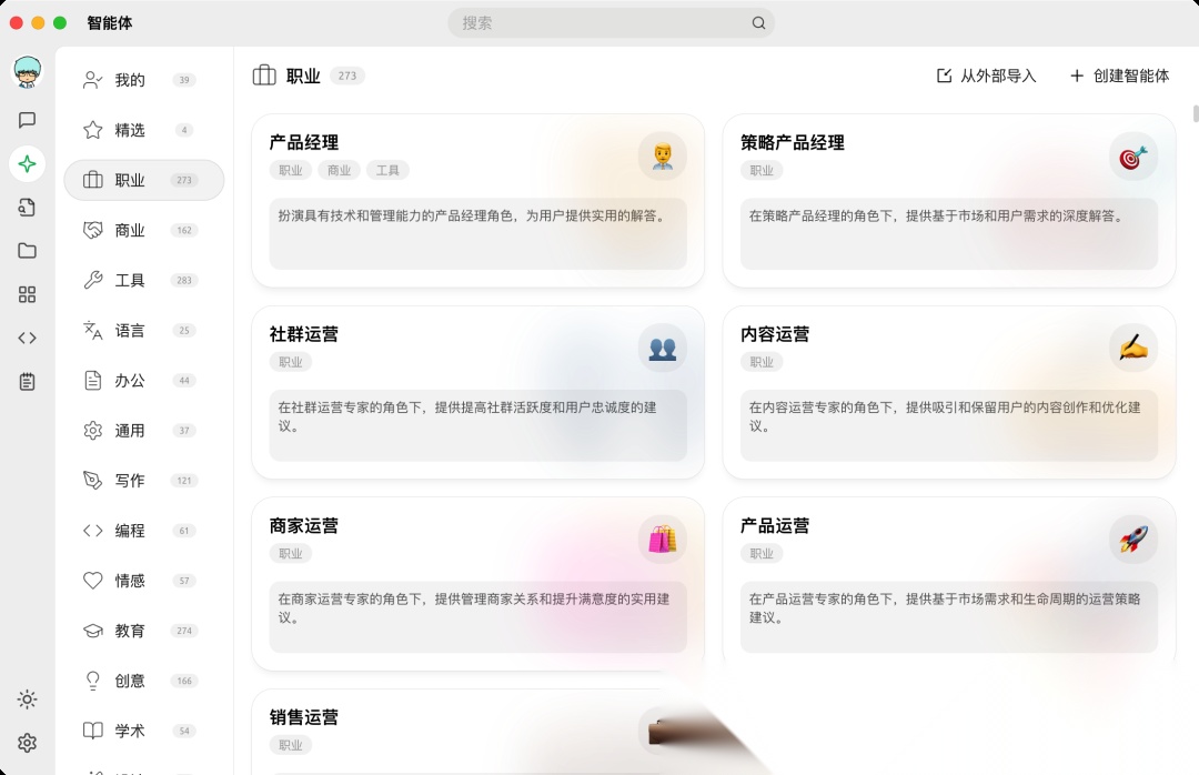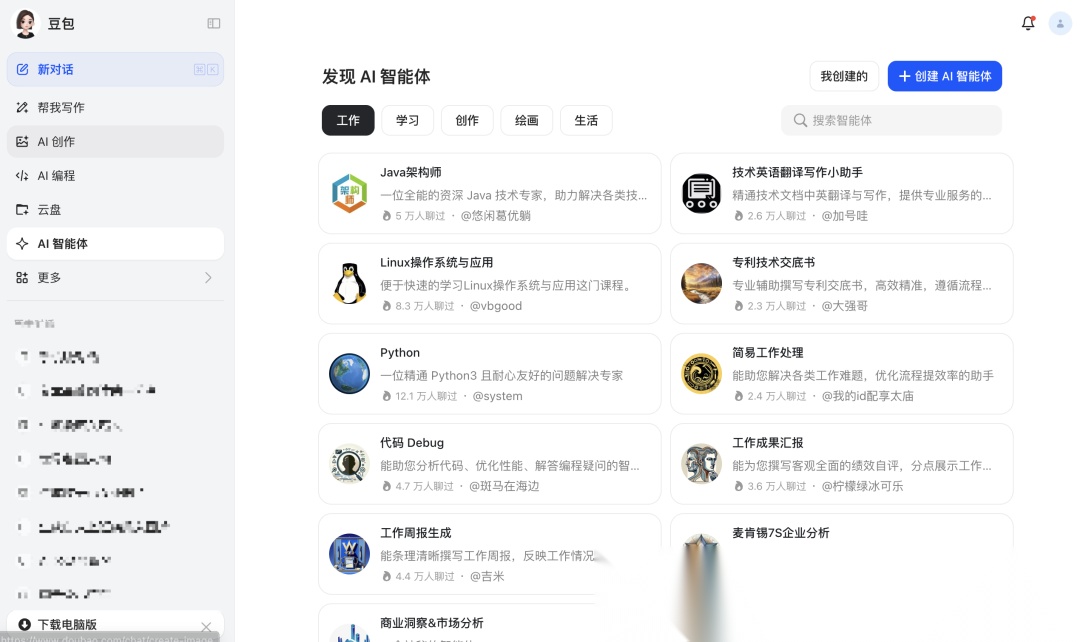像 豆包 、Cherry Studio、 扣子(Coze),它们更像是“智能体的创建平台”。从结构上看,它们提供了完整的“大脑”(模型)、“记忆”和“工具(如插件)”组件,让普通人也能搭建智能体。