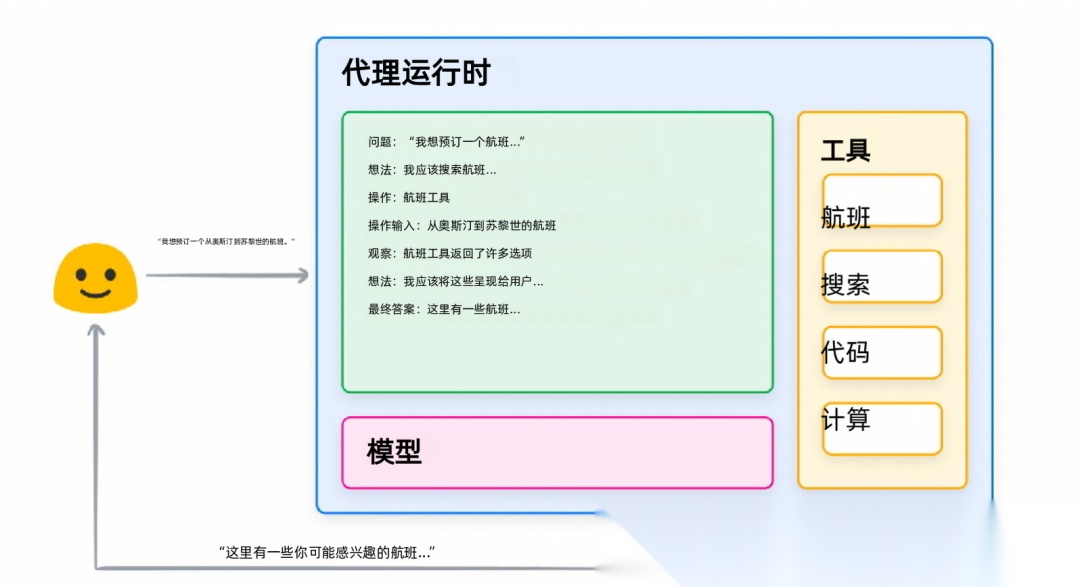行动(工具): 它调用“搜索引擎”工具查航班,调用“计算器”工具比价。