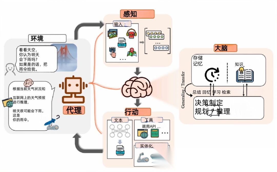 它可以感知环境,获取输入可能是文本、图片、视频、音频等。它有“大脑”可以进行规划、存储,也能执行各种行动,包括输出文本、调用工具、操作机械臂等。