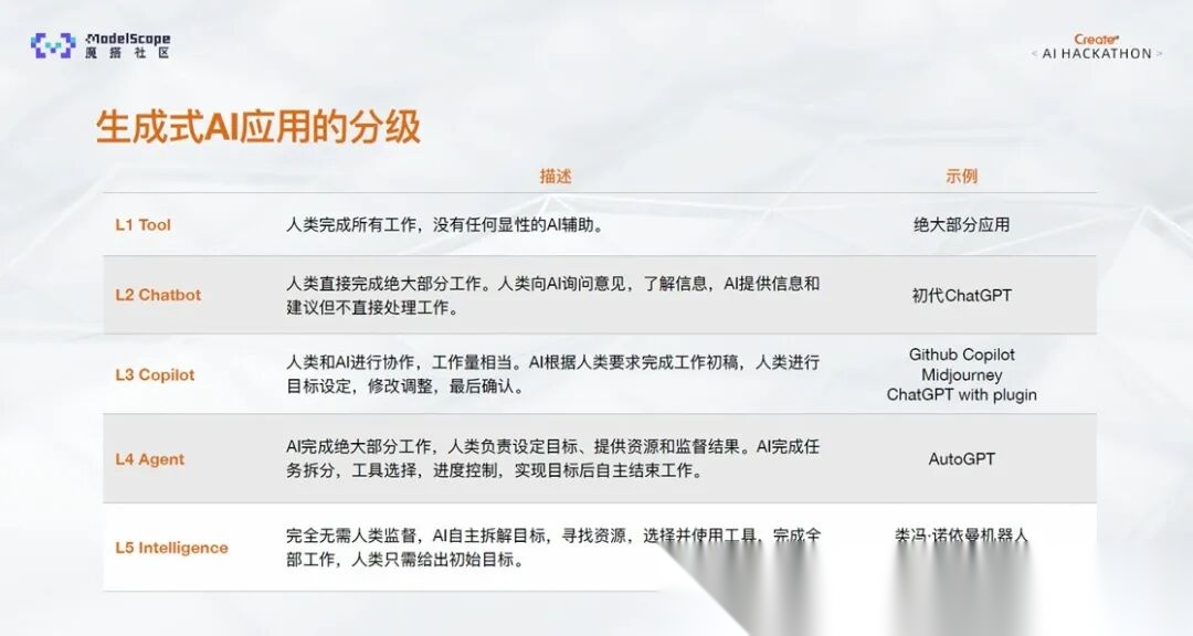 而 Agent 的话,其实需要 AI 完成更多工作,人类主要负责设定目标、提供资源、监督结果。Agent 需要自主完成任务拆解、工具选择、进度控制,实现后自主结束工作。