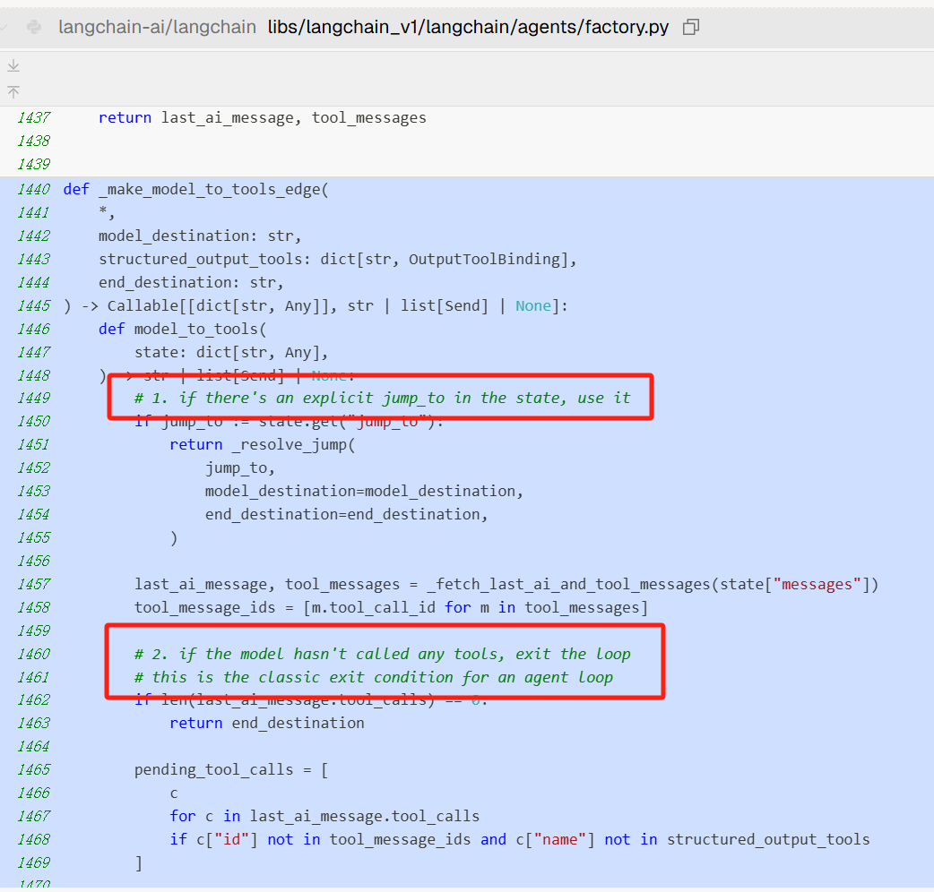 上面两张图的代码在文末参考链接中的 towardsai 文章中, 没有用到1.0版本新的API,大家可以看到处理节点之间流转的代码有很多。如果用 create_agent 可以把图相关的代码简化掉,另外 tool call 的调用也比判断输出中是否包含特定的字符串优雅。
