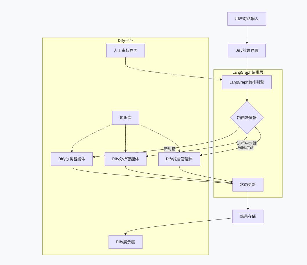 - Dify负责:实现单个智能体的专业能力、提供用户界面、管理知识库集成