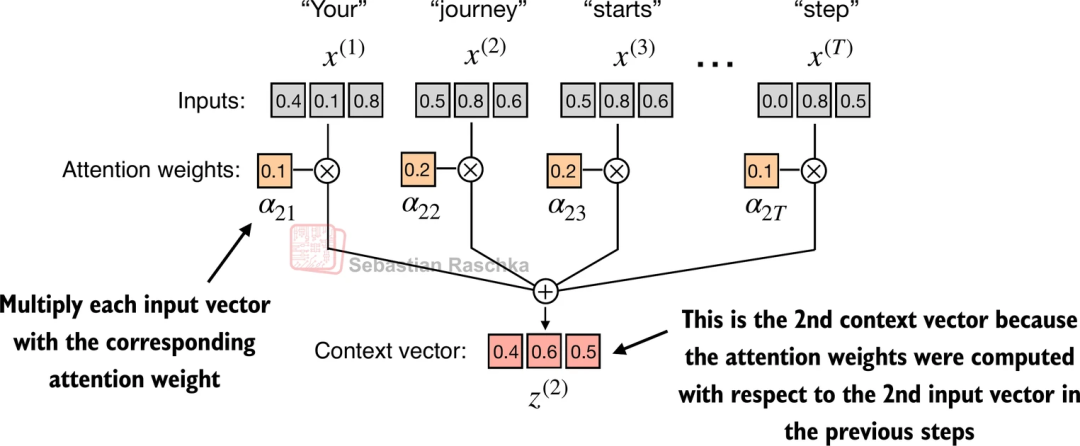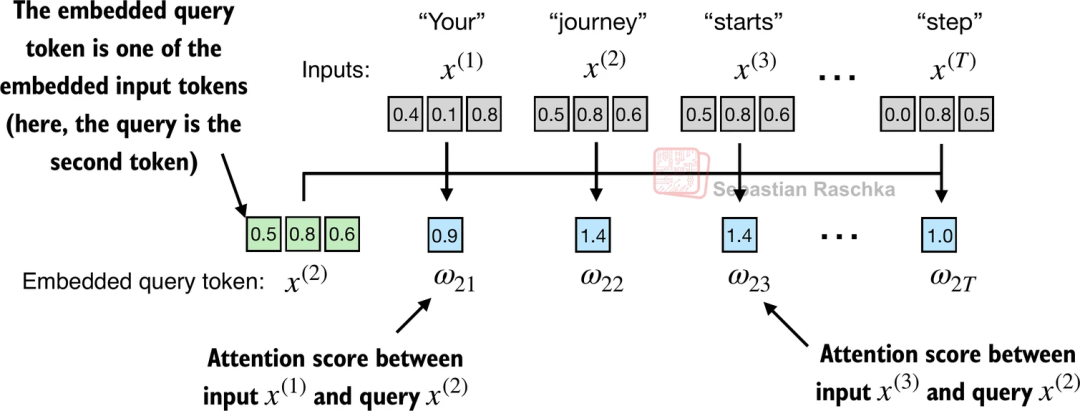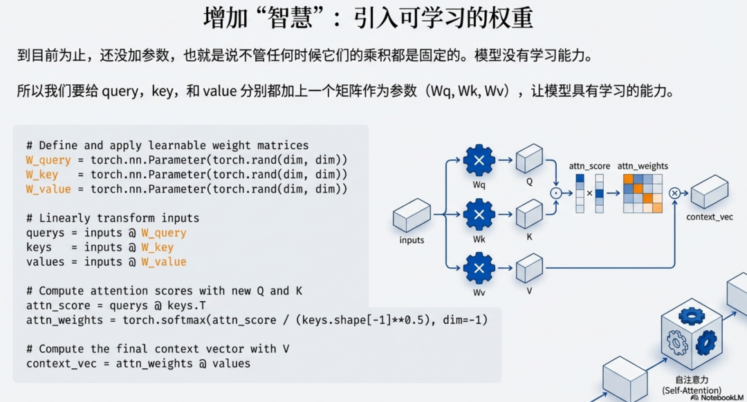 dim = inputs.shape[1] # 词向量维度# 定义三个可训练的参数矩阵# 在实际 PyTorch 源码中,通常使用 nn.Linear 实现W_query = torch.nn.Parameter(torch.rand(dim, dim))W_key = torch.nn.Parameter(torch.rand(dim, dim))W_value = torch.nn.Parameter(torch.rand(dim, dim))# 1. 线性变换:将输入映射为 Q, K, Vquerys = inputs @ W_querykeys = inputs @ W_keyvalues = inputs @ W_value# 2. 计算注意力分数 (Scaled Dot-Product Attention)# [seq_len, dim] @ [dim, seq_len] -> [seq_len, seq_len]attn_scores = querys @ keys.T # 3. 缩放 (Scaling) 与 归一化 (Softmax)# 除以根号 dim,防止数值过大scale_factor = keys.shape[-1] ** 0.5attn_weights = torch.softmax(attn_scores / scale_factor, dim=-1)# 4. 加权求和得到上下文向量# [seq_len, seq_len] @ [seq_len, dim] -> [seq_len, dim]context_vec = attn_weights @ values