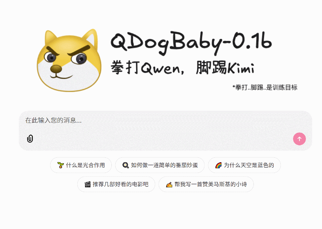 TIPS: 由于网络环境/资源等原因,演示模型没有对外部署,感兴趣的同学可以使用 minimind 提供的数据集,配合 codebuddy 快速生成训练逻辑,训练出一个属于自己的LLM。