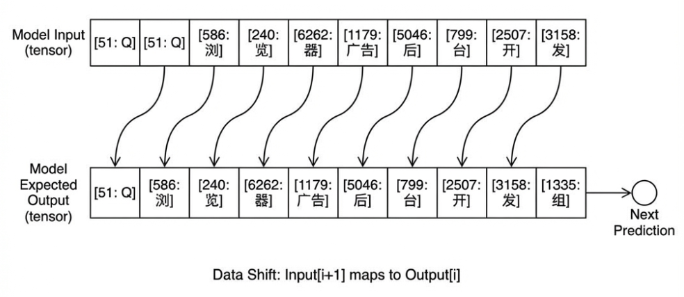 # 原始语料数据 (假设这是分词后的 ID 序列)# 对应文本: Q Q 浏 览 器 广 告 后 台 开 发 组data = [51, 51, 586, 240, 6262, 1179, 5046, 799, 2507, 3158, 1335]data_tensor = torch.tensor(data)# 1. 构造输入 (Input): 取序列的前 N-1 个字# 也就是: "QQ浏览器广告后台开发"x = data_tensor[:-1] # x = [51, 51, 586, ..., 3158]# 2. 构造目标 (Target): 取序列的后 N-1 个字 (即每个位置对应的"下一个字")# 也就是: "Q浏览器广告后台开发组"y = data_tensor[1:] # y = [51, 586, 240, ..., 1335]print(f"输入长度: {len(x)}, 目标长度: {len(y)}")# 输入长度: 11, 目标长度: 11 (一一对应)# 3. 扔进模型计算logits = model(x.unsqueeze(0)) # 增加 batch 维度# 4. 计算 Loss (交叉熵损失)# 这一步是在问模型:# 当输入第1个'Q'时,你预测是第2个'Q'的概率大吗?# 当输入'浏'时,你预测是'览'的概率大吗?# ...# 当输入'发'时,你预测是'组'的概率大吗?loss = nn.cross_entropy(logits.view(-1, vocab_size), y.view(-1))loss.backward() # 反向传播,修正参数