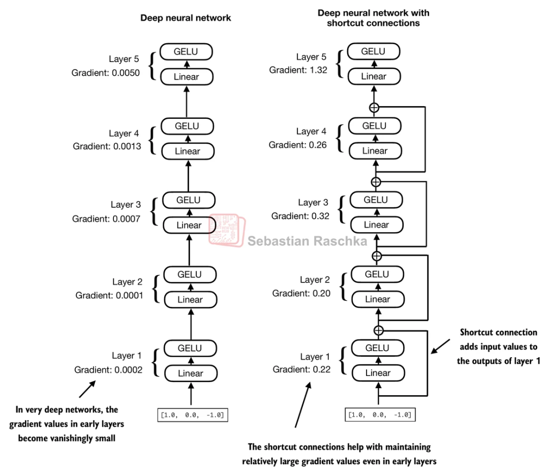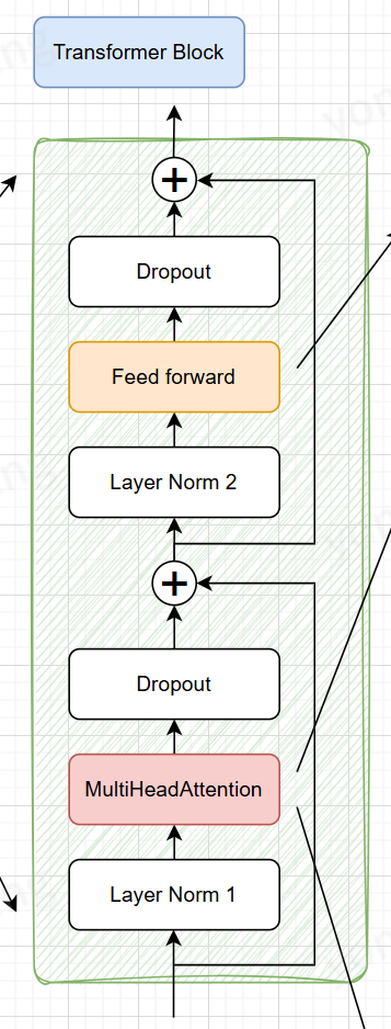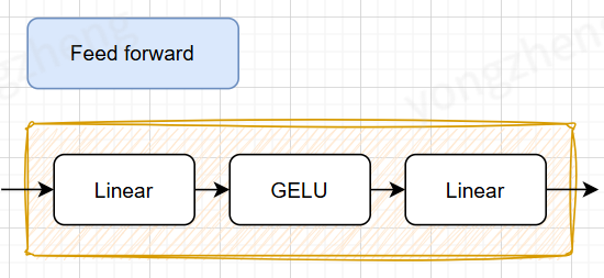 class FeedForward(nn.Module): def init(self, emb_dim, dropout): super().init() self.linear1 = nn.Linear(emb_dim, emb_dim * 4) self.linear2 = nn.Linear(emb_dim * 4, emb_dim) def forward(self, x): x = self.linear1(x) x = nn.GELU()(x) x = self.linear2(x) return x