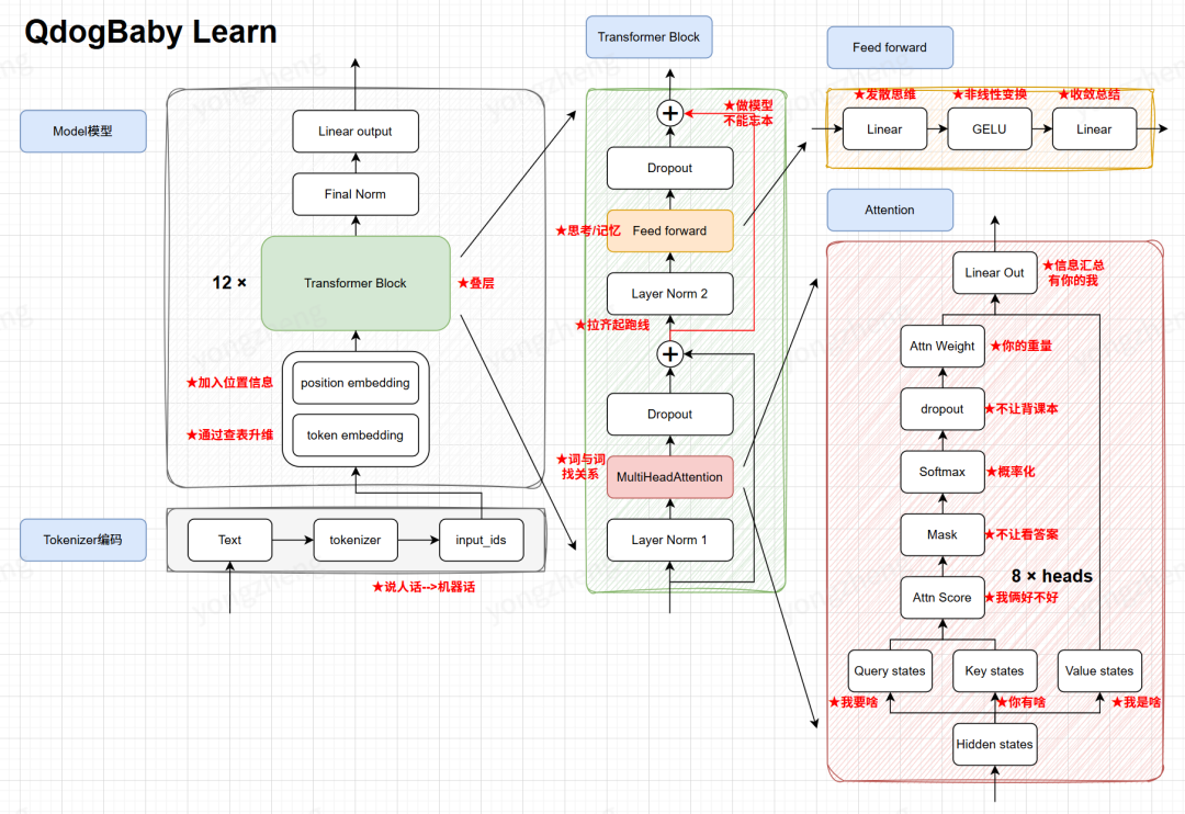 import torchfrom torch import nn# ==========================================# 1. 配置清单 (相当于装修前的设计图纸)# ==========================================class QdogBabyLearnConfig(): def __init__(self): self.model_name = "qdogbabylearn" self.version = "1.0.0" self.num_hidden_layers = 16# 盖多少层楼 (Transformer Block的数量) self.num_heads = 8 # 雇多少个专家同时看 (多头注意力的头数) self.emb_dim = 512 # 词向量的宽度 (每个词包含多少信息量) self.dropout = 0.0 # 随机扔掉多少神经元 (防止死记硬背) self.context_size = 512 # 一次能看多长的文章 (上下文窗口大小) self.vocab_size = 6400 # 字典里有多少个字 (词表大小)# ==========================================# 2. 模型主体 (QdogBabyLearn 机器人本体)# ==========================================class QdogBabyLearnLLM(nn.Module): def __init__(self, config: QdogBabyLearnConfig): super().__init__() self.config = config # ★ 查表升维:把离散的字变成向量 self.tok_emb = nn.Embedding(config.vocab_size, config.emb_dim) # ★ 加入位置信息:让模型知道“我爱你”和“你爱我”顺序不同 self.pos_emb = nn.Embedding(config.context_size, config.emb_dim) self.dropout = nn.Dropout(config.dropout) # ★ 叠罗汉:堆叠 16 层 Transformer Block self.transformer_blocks = nn.Sequential( *[TransformerBlock(config.emb_dim, config.num_heads, config.dropout, config.context_size) for _ in range(config.num_hidden_layers)] ) # 最后输出前的标准化 self.norm = LayerNorm(config.emb_dim) # ★ 映射回字典:把向量变回预测下一个字的概率分数 self.out = nn.Linear(config.emb_dim, config.vocab_size) def forward(self, x): # x 的形状: [batch_size, seq_len] (比如: [[1, 2, 3]]) # 1. 查词表 tok_embeds = self.tok_emb(x) # 2. 查位置表 pos_embeds = self.pos_emb(torch.arange(x.shape[1], device=x.device)) # 3. 信息融合 (词义 + 位置) x = tok_embeds + pos_embeds x = self.dropout(x) # 4. 经过 16 层“思考” x = self.transformer_blocks(x) # 5. 最终整理 x = self.norm(x) x = self.out(x) # 输出形状: [batch_size, seq_len, vocab_size] return x # ==========================================# 3. Transformer Block (模型的大脑皮层)# ==========================================class TransformerBlock(nn.Module): def __init__(self, emb_dim, num_heads, dropout, context_size): super().__init__() self.multi_head_attn = MultiHeadAttention(emb_dim, num_heads, dropout, context_size) self.layer_norm1 = LayerNorm(emb_dim) self.feed_forward = FeedForward(emb_dim, dropout) self.layer_norm2 = LayerNorm(emb_dim) def forward(self, x): # --- 第一步:注意力机制 (词与词找关系) --- residual = x # ★ 做模型不能忘本:先记住原始输入 x = self.layer_norm1(x) # ★ 拉齐起跑线 x = residual + self.multi_head_attn(x) # 原始信息 + 新学到的关系 # --- 第二步:前馈网络 (思考/记忆) --- residual = x # ★ 再次记住当前状态 x = self.layer_norm2(x) # ★ 拉齐起跑线 x = residual + self.feed_forward(x) # 原始信息 + 思考后的结果 return x# ==========================================# 4. 多头注意力 (核心:我要啥、你有啥、我是啥)# ==========================================class MultiHeadAttention(nn.Module): def __init__(self, emb_dim, num_heads, dropout, context_size): super().__init__() self.emb_dim = emb_dim self.num_heads = num_heads self.head_dim = emb_dim // num_heads # 每个头负责的维度 (512/8 = 64) # 定义 Q, K, V 的映射层 self.W_querys = nn.Linear(emb_dim, emb_dim) # 我要啥 self.W_keys = nn.Linear(emb_dim, emb_dim) # 你有啥 self.W_values = nn.Linear(emb_dim, emb_dim) # 我是啥 self.out = nn.Linear(emb_dim, emb_dim) # 信息汇总 self.dropout = nn.Dropout(dropout) # ★ Mask (不让看答案):创建一个下三角矩阵 # 1 0 0 # 1 1 0 # 1 1 1 self.register_buffer("mask", torch.tril(torch.ones(context_size, context_size))) def forward(self, x): batch_size, num_tokens, emb_dim = x.shape # 1. 线性变换生成 Q, K, V querys = self.W_querys(x) keys = self.W_keys(x) values = self.W_values(x) # 2. 切分成多头 (8个人分工合作) # 形状变换: [B, T, 512] -> [B, T, 8, 64] querys = querys.view(batch_size, num_tokens, self.num_heads, self.head_dim) keys = keys.view(batch_size, num_tokens, self.num_heads, self.head_dim) values = values.view(batch_size, num_tokens, self.num_heads, self.head_dim) # 3. 转置,把头(Head)放到前面,方便并行计算 # 形状变换: [B, 8, T, 64] querys = querys.transpose(1, 2) keys = keys.transpose(1, 2) values = values.transpose(1, 2) # 4. 计算相似度 (我俩好不好) # Q @ K^T attn_score = querys @ keys.transpose(-1, -2) # 5. ★ Mask 操作 (不让偷看后面的词) # 把 mask 为 0 的位置填成负无穷大 (-inf) mask_bool = self.mask.bool()[:num_tokens, :num_tokens] attn_score = attn_score.masked_fill(mask_bool == 0, float('-inf')) # 6. 归一化 (概率化) # 除以根号dk是为了防止梯度消失 attn_weight = torch.softmax(attn_score / (self.head_dim ** 0.5), dim=-1) attn_weight = self.dropout(attn_weight) # 7. 加权求和 (有你的我) # Weight @ V context_vec = attn_weight @ values # 8. 还原形状 (把8个头的结果拼回去) # [B, 8, T, 64] -> [B, T, 8, 64] -> [B, T, 512] context_vec = context_vec.transpose(1, 2).contiguous().view(batch_size, num_tokens, emb_dim) # 9. 最终线性输出 context_vec = self.out(context_vec) return context_vec# ==========================================# 5. 前馈网络 (发散思维 -> 收敛总结)# ==========================================class FeedForward(nn.Module): def __init__(self, emb_dim, dropout): super().__init__() # ★ 发散思维:维度放大 4 倍 (512 -> 2048) self.linear1 = nn.Linear(emb_dim, emb_dim * 4) # ★ 收敛总结:维度变回原样 (2048 -> 512) self.linear2 = nn.Linear(emb_dim * 4, emb_dim) def forward(self, x): x = self.linear1(x) x = nn.GELU()(x) # 非线性激活 (增加脑回路的复杂度) x = self.li