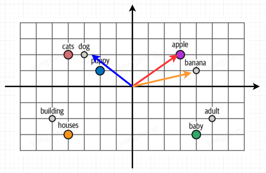 如何找到token与token之间的关系?回到我们刚刚embedding后的空间,如果我们在空间中建立一个坐标系,会发现,当两个向量含义相近时,他们的点积会比较大,而两个向量没什么关系时,它们的点积会是0甚至负数.