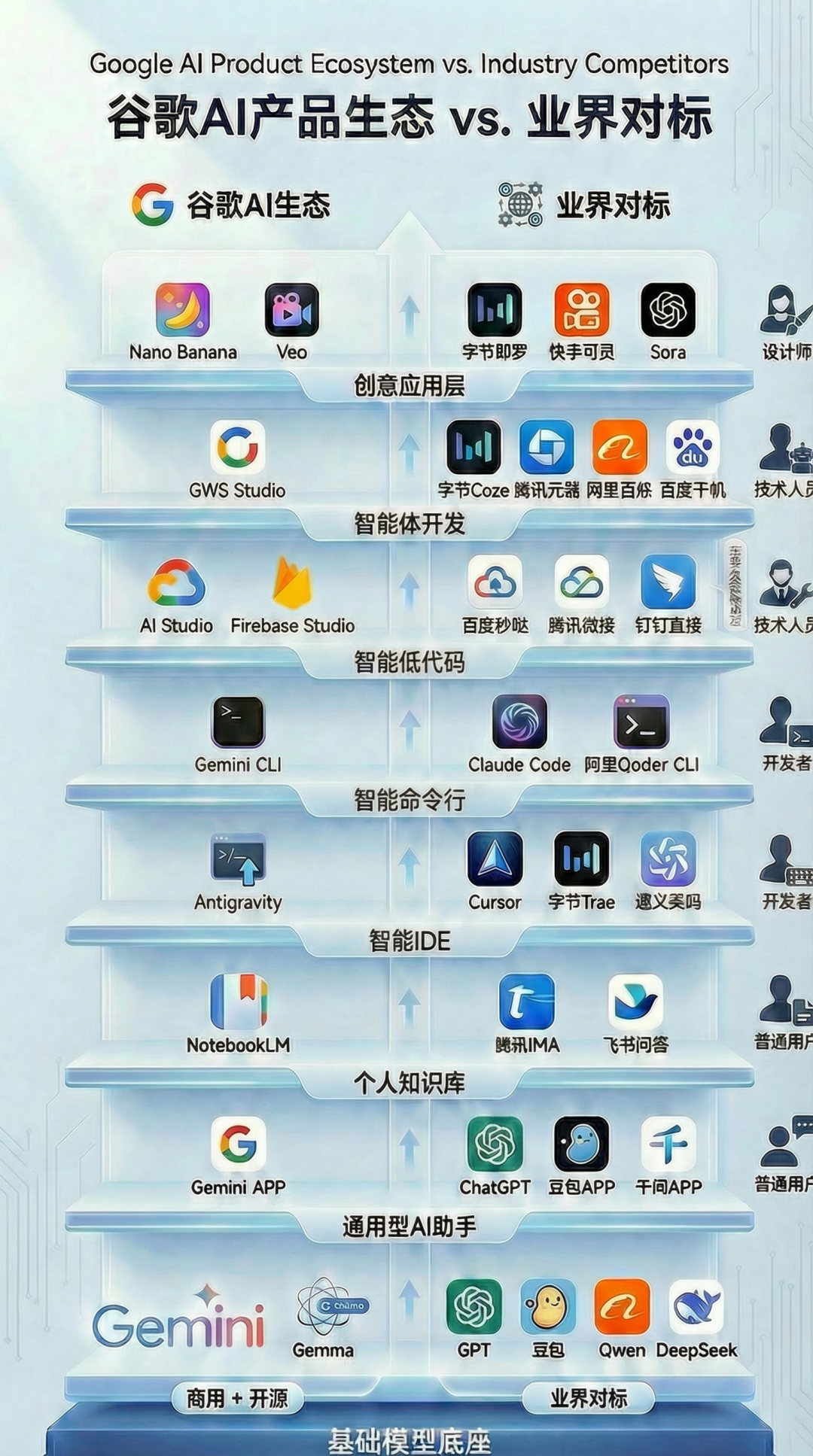 这份产品货架图清晰地展示了Google如何基于其基础模型底座,构建了一整套垂直、分层、且与业界主流产品全面对标的AI产品矩阵。