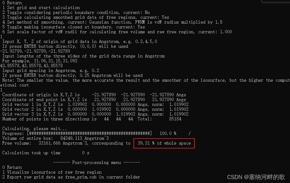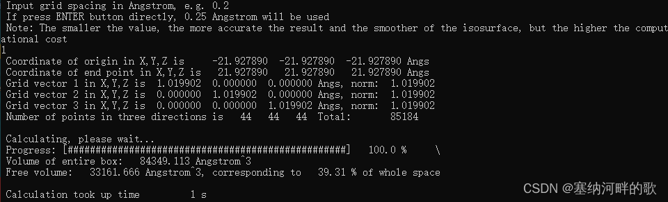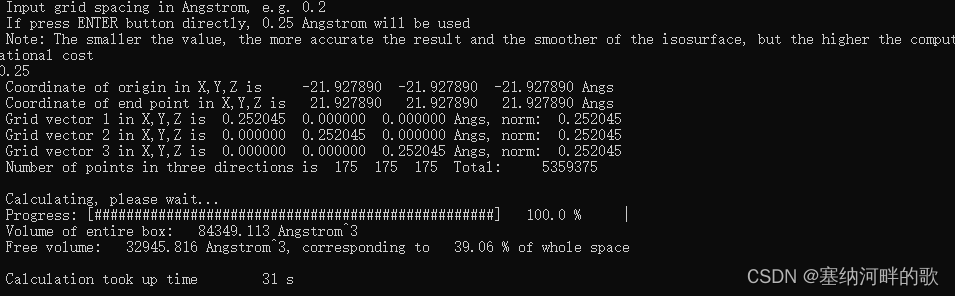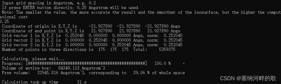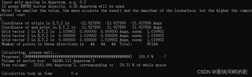 输入:43.85578,43.85578,43.85578 (输入轨迹文件中的值的两倍)(//如果直接回车,则默认用晶胞的三个边长作为格点数据计算范围的三个边长,但这里的pdb文件中没有边长,不修改的话最后自由体积分数就会是0)