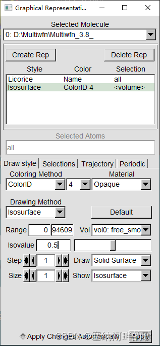 启动VMD后将之载入,进入Graphics - Representation,点Create Rep,把设置改为下面的样子来显示出等值面