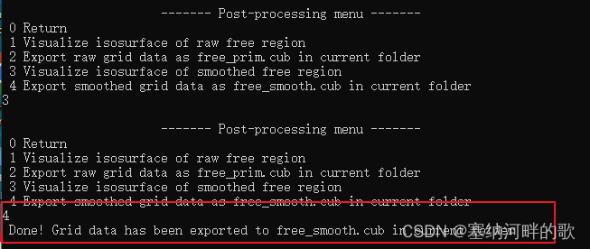 为了得到更好的图像效果,点击Return后,选择4,将格点数据导出为当前目录(Multiwfn安装目录)下的free_smooth.cub文件