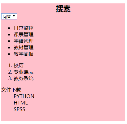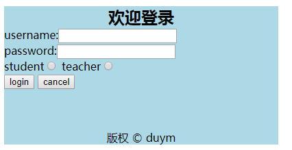 <!DOCTYPE html> <html lang="en"> <head> <meta charset="UTF-8"> <title>欢迎登陆</title> </head> <body> <div id="container" style="width:400px " > <div id="header" style="background-color:lightblue;"><h2 align="center" style="margin-bottom:0;">欢迎登录</h2></div> <div id="content" style="background-color:lightblue;height:150px;width:400px;float:left;"> <form> username:<input type="text"name="mingzi"><br> password:<input type="password"name="mima"><br> student<input type="radio"name="role"value="student" > teacher<input type="radio"name="role"value="teacher" ><br> <input type="button"value="login"> <input type="button"value="cancel"> </form> </div> <div id="footer" style="background-color:lightblue;clear:both;text-align:center;">版权 © duym</div> <div id="answer" style="width:400px " ></div> <div id="title" style="background-color:pink;"><h2 align="center" style="margin-bottom:0;">搜索</h2></div> <div id="search" style="background-color:pink;height:350px;width:400px;float:left;"> <form> <select> <option>问答</option> <option>收藏</option> </select> </form> <ul> <li>日常监控</li> <li>课表管理</li> <li>学籍管理</li> <li>教材管理</li> <li>教学简报</li> </ul> <ol> <li>校历</li> <li>专业课表</li> <li>教务系统</li> </ol> <dl> <dt>文件下载</dt> <dd>PYTHON</dd> <dd>HTML</dd> <dd>SPSS</dd> </dl> </div></div> </body> </html>