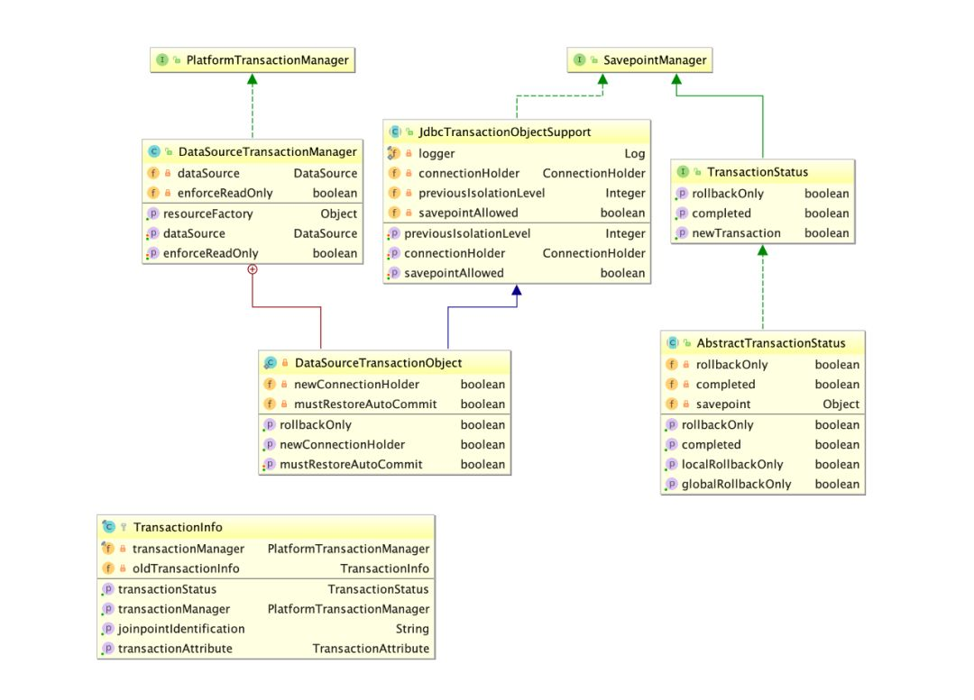 1、调用doGetTransaction创建事务对象DataSourceTransactionObject。它继承JdbcTransactionObjectSupport实现的接口是SavepointManager,为当前事务提供创建保存点、回退到保存点、释放保存点继续执行的支持,而具体的创建保存点这些操作会交给ConnectionHolder完成的。DataSourceTransactionObject还会保存之前的事务隔离级别,用于当前事务退出时,还原Connection的事务隔离级别,否则当连接放入连接池被复用时就可能出现问题。