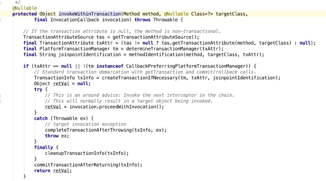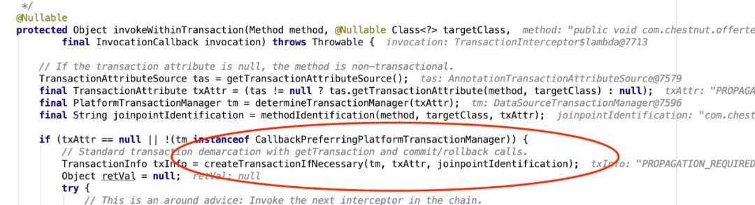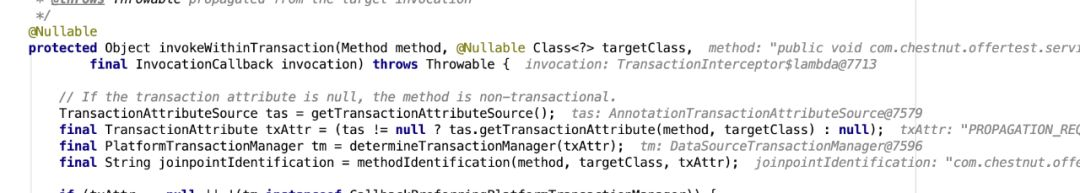 由于invoke方法调用invokeWithinTransaction,自身并不做任何事情,所以直接看invokeWithinTransaction方法。