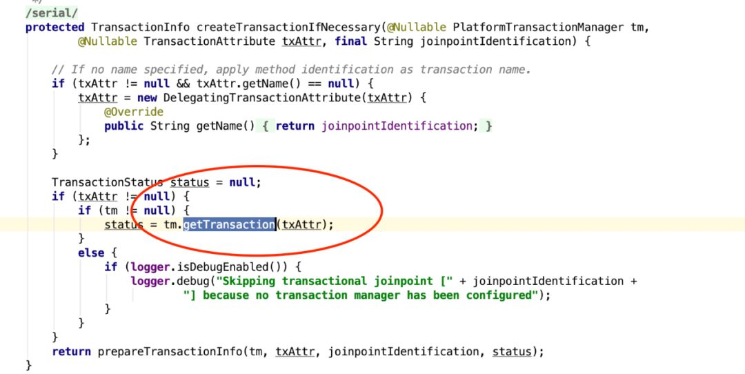 调用createTransactionIfNecessary方法创建事务(如果需要),IfNecessary说明并不一定会创建,比如当前已经存在一个事务,则根据事务的传播机制决定是否要创建。createTransactionIfNecessary方法返回一个TransactionInfo,TransactionInfo保存事务信息,如旧的事务的TransactionInfo、事务属性配置、事务管理器、当前事务方法的事务状态。