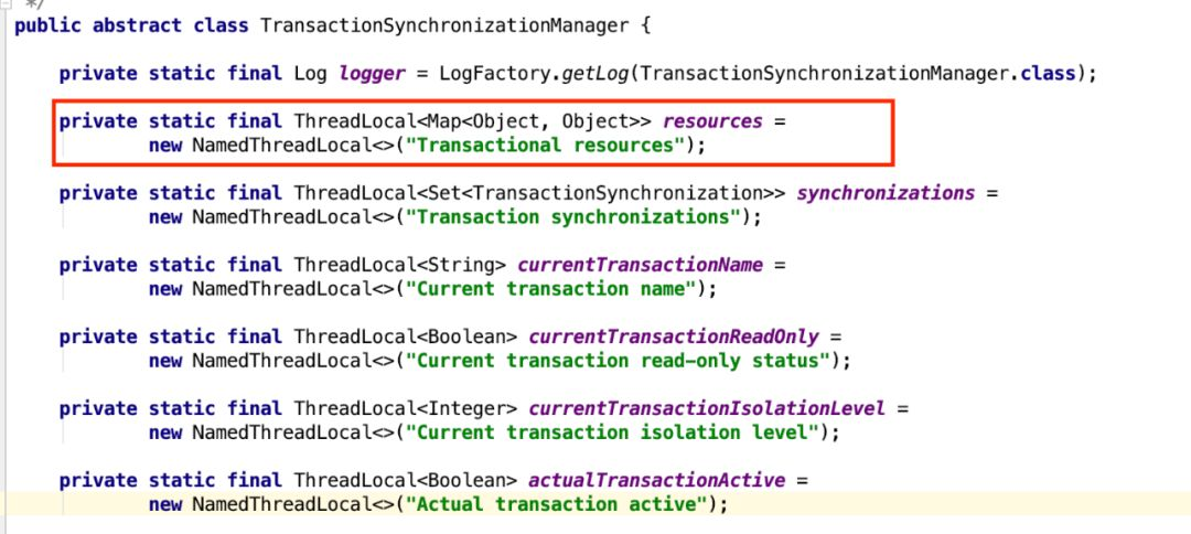 这个TransactionSynchronizationManager前面分析事务的时候已经很熟悉了,它用于存储当前线程数据,而且都是使用resources这个静态字段存储的,这是一个ThreadLocal。