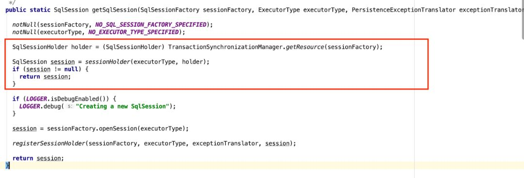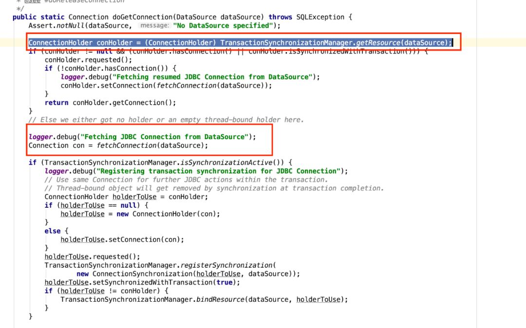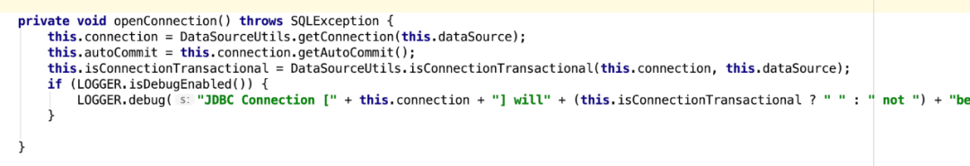 SpringManagedTransaction的getConnection方法如果当前已经打开一个连接,则返回当前连接,否则调用DataSourceUtils工具类的getConnection方法获取连接,而getConnection方法传递的参数是当前SpringManagedTransaction对象持有的数据源。根据数据源从TransactionSynchronizationManager中看看当前是否有事务打开了连接,如果有,则从TransactionSynchronizationManager拿到当前事务使用的连接。