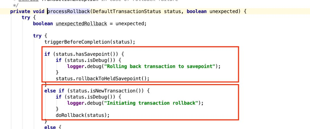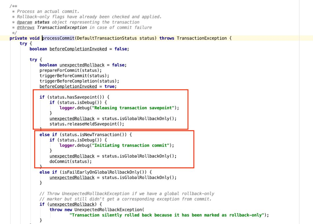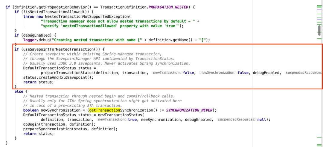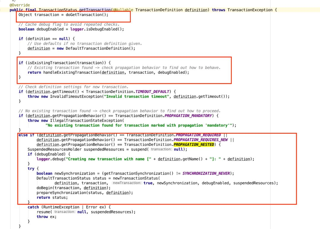 这里会涉及到几种传播机制的处理,此处我只介绍其中的一种传播机制的处理。PROPAGATION_NESTED:如果当前存在事务,则在嵌套事务内执行;如果当前没有事务,则进行与PROPAGATION_REQUIRED类似的操作。