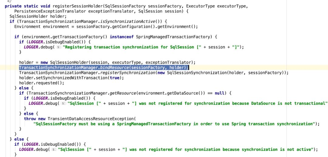 2、将创建的SqlSession放到SqlSessionHolder中,将其绑定到TransactionSynchronizationManager(ThreadLocal)。一个事务中,如果执行的命令都是同一种类型,如update,则只会创建一个DefaultSqlSession。如果已经持有一个DefaultSqlSession则会直接使用。