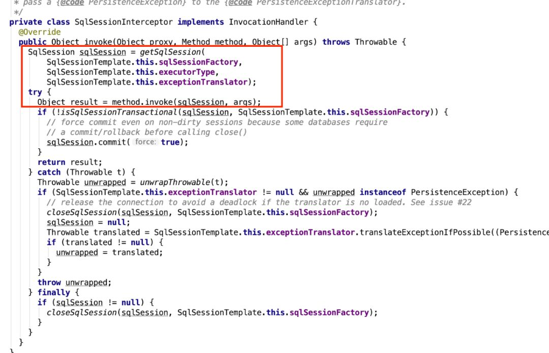 调用SqlSessionTemplate的方法会进入SqlSessionInterceptor的invoke方法(JDK动态代理,SqlSessionInterceptor是InvocationHandler)。此时才会真正的去获取一个SqlSession。