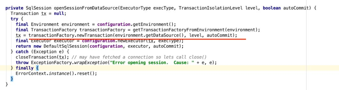 SqlSession的创建在SqlSessionFactory的openSessionFromDataSource方法中完成的。
