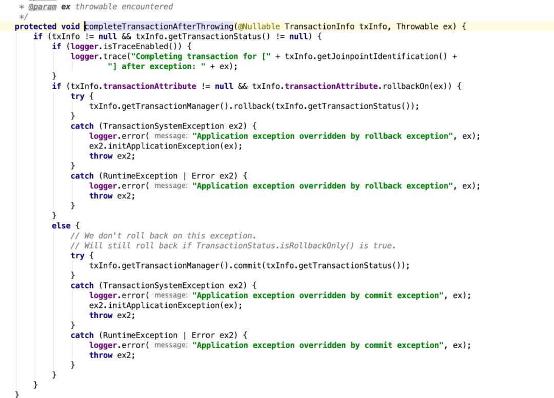 TransactionInterceptor是事务方法拦截器,或叫切面。TransactionInterceptor继承TransactionAspectSupport。本篇不分析Spring AOP部分的实现,只关注事务的实现。