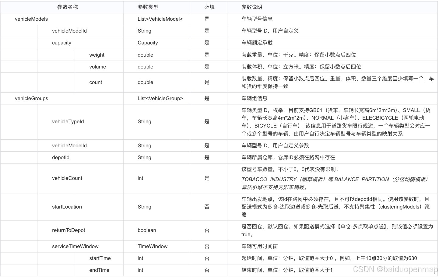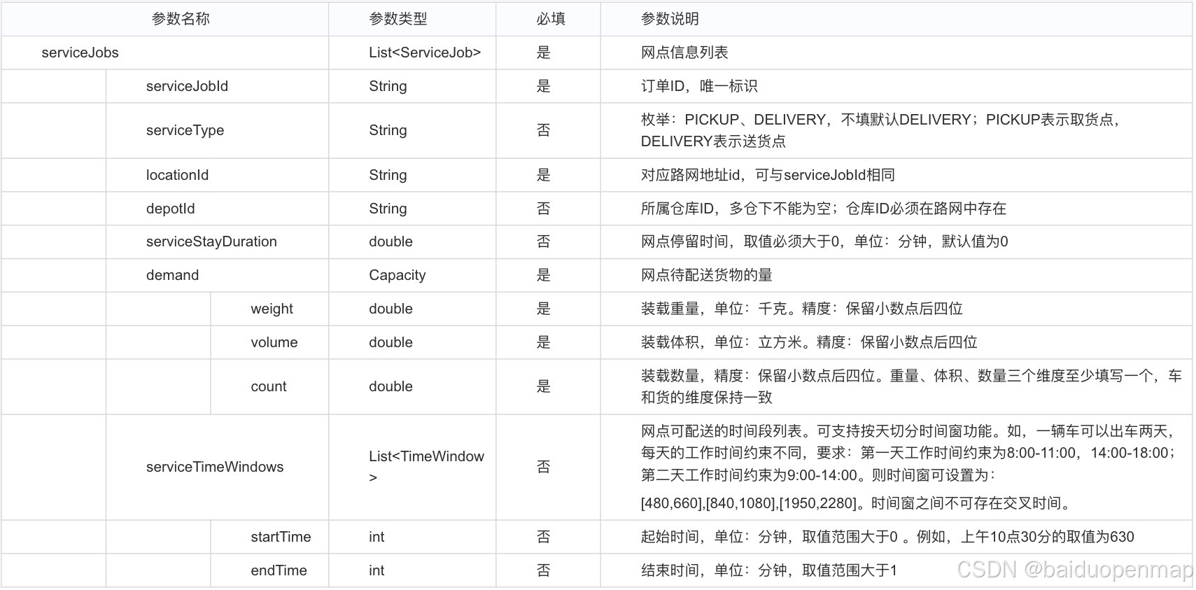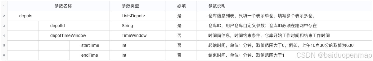 仓库必填以及常用字段分别为depotId(仓库ID)、depotTimeWindow(仓库工作范围时间窗),具体介绍见下表。