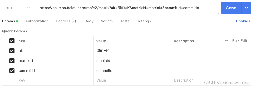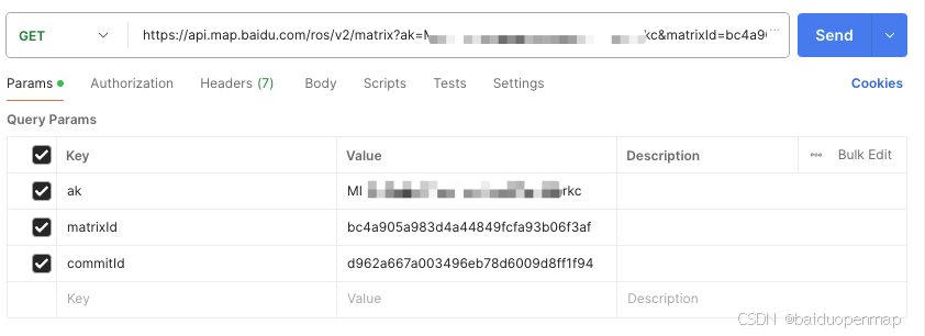 首先将仓库、取货点、送货点的坐标进行汇总,然后调用路网矩阵创建接口(智能调度路网矩阵服务 | 百度地图API SDK)创建路网矩阵。