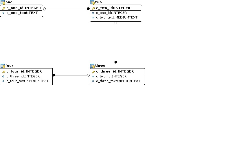 Hibernate: select this_.c_one_id as c1_3_, this_.c_one_text as c2_3_3_,twos2_.c_one_id as c2_5_, twos2_.c_two_id as c1_5_, twos2_.c_two_id as c1_0_,twos2_.c_one_id as c2_2_0_, twos2_.c_two_text as c3_2_0_, threes3_.c_two_id asc2_6_, threes3_.c_three_id as c1_6_, threes3_.c_three_id as c1_1_,threes3_.c_two_id as c2_1_1_, threes3_.c_three_text as c3_1_1_,fours4_.c_three_id as c2_7_, fours4_.c_four_id as c1_7_, fours4_.c_four_id asc1_2_, fours4_.c_three_id as c2_0_2_, fours4_.c_four_text as c3_0_2_ from Onethis_ left outer join Two twos2_ on this_.c_one_id=twos2_.c_one_id left outerjoin Three threes3_ on twos2_.c_two_id=threes3_.c_two_id left outer join Fourfours4_ on threes3_.c_three_id=fours4_.c_three_id where this_.c_one_id=?