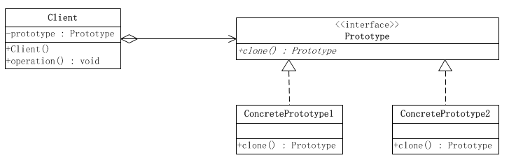 public class Client { /** * 持有需要使用的原型接口对象 */ private Prototype prototype; /** * 构造方法,传入需要使用的原型接口对象 */ public Client(Prototype prototype){ this.prototype = prototype; } public void operation(Prototype example){ //需要创建原型接口的对象 Prototype copyPrototype = prototype.clone(); } }